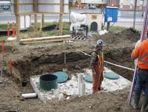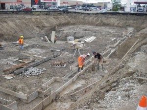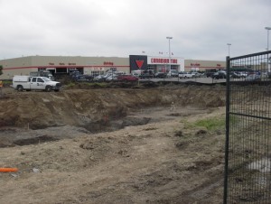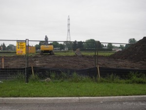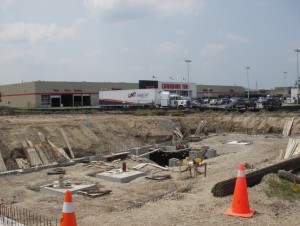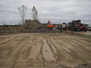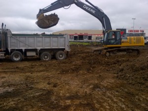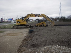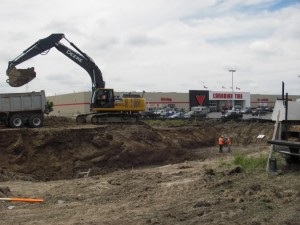 The foundation has now been backfilled with stone and gravel. Excavation has begun to level and manipulate the earth for the future parking lot.