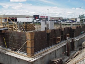 The basement level reinforcement bars are up. Forms in the South/West corner have been erected. Pouring concrete for the basement walls began today.