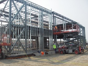 Excavation and preparation for the Septic System started today. The roof was started and my office space is starting to take shape with the steel studs.