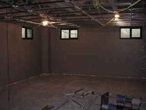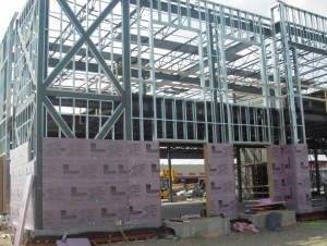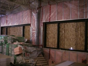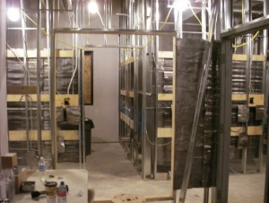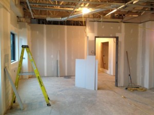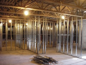 The steel studs in the basement start to give shape to the staff area. Plywood backing will give support to x-ray heads, etc. Stairways started also.