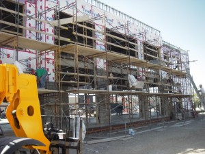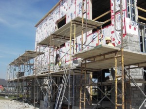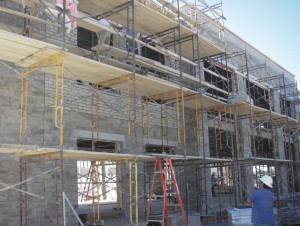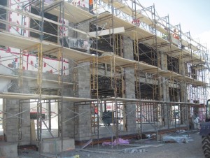 Scaffolding for the mason to place the stone and brick went up today. As well, the concrete on the main floor was poured.
