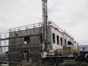Concrete continues to arrive and the footings are almost fully poured around the entire circumference. The elevator base is poured.