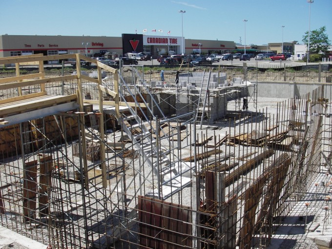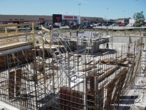 The West basement foundation walls have been poured and erected. Cinder block is being built around elevator shaft.