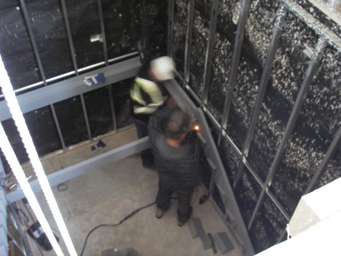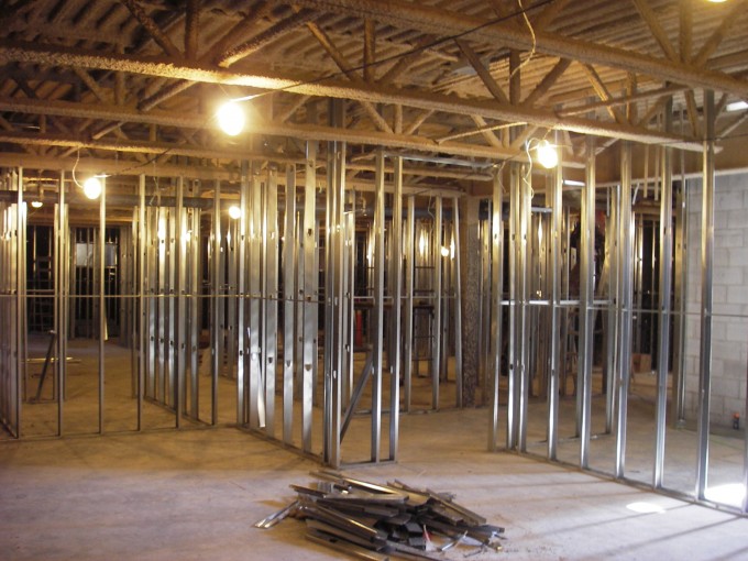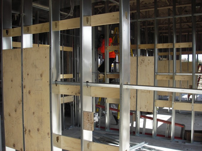 The steel studs in the basement start to give shape to the staff area and storage in the basement. Plywood backing will provide support to x-ray heads, cabinets, etc. Emergency exit stairways starting to be installed.