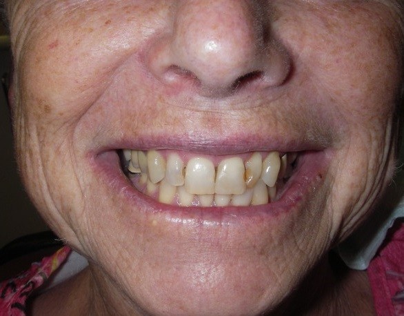 This new patient presented asking me to extract all remaining upper teeth. I did not feel that all teeth required extraction. We ended up only extracting 2 of the remaining upper teeth. Crowns and a partial upper denture transformed this patient and changed the smile forever.