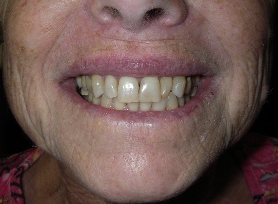 This patient had a previous crown on the front right tooth placed many years ago. Unfortunately the previous crown did not cover the entire discoloured root of the tooth. We removed the previous crown and extended the new crown length to cover the entire discoloured root.
