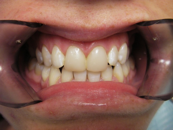 This young female was not pleased with the `dead` looking appearance of her bonded two top front teeth. We fabricated 2 Porcelain Veneers. It is now virtually impossible to tell which are veneers!