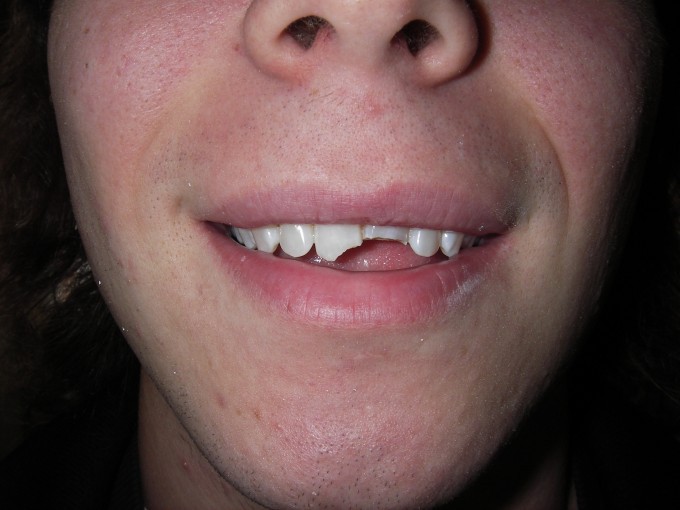 Hockey Accident - This individual was lucky in the sense that the nerve was not exposed. We were able to restore his front teeth with two crowns. It is almost impossible to tell which are crowns today.