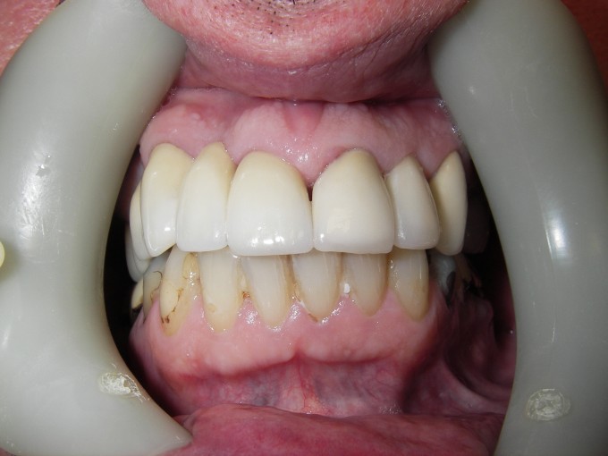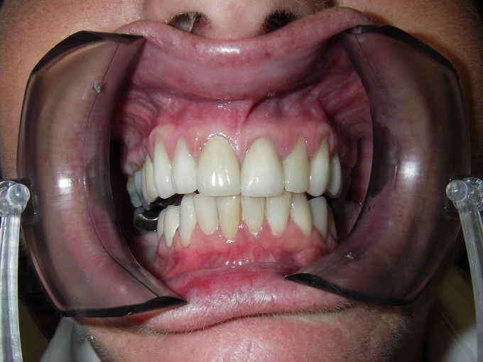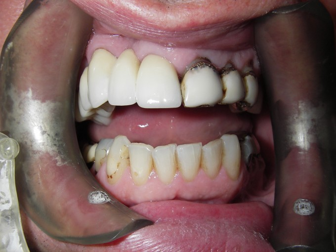Years of excessive grinding and swishing Coca-Cola can cause significant wear and erosion. 12 crowns were fabricated and cemented to make a significant improvement in appearance. Crowns also were able to increase the length / height of the upper teeth due to the wear.